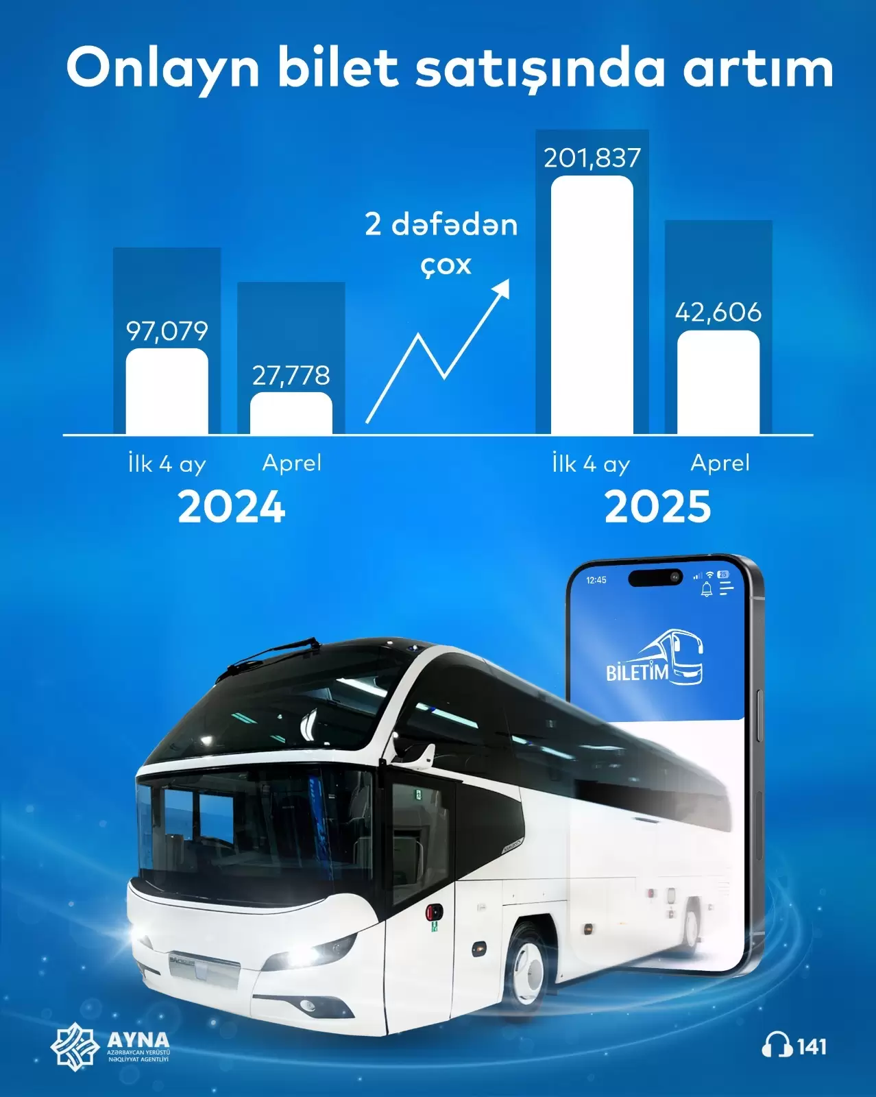 Bu ilin yanvar-aprel ayları ərzində “biletim.az” portalı vasitəsilə onlayn qaydada 201837 bilet əldə edilib. Bu, 2024-cü ilin müvafiq dövrü ilə müqayisədə 2 dəfə çoxdur. Ötən ilin ilk 4 ayı ərzində onlayn qaydada 97079 bilet əldə edilib.