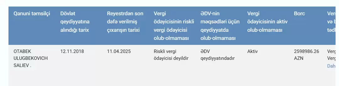 Məlumata görə, İqtisadiyyat Nazirliyinin İqtisadi Zonaların İnkişafı Agentliyinin (İZİA) tabeliyində olan Hacıqabul Sənaye Məhəlləsində avtomobil istehsalının boyaq, qaynaq və yığım işlərini həyata keçirən “Azərmaş CP” MMC-nin təkcə vergi borcu 2 milyon 598 min 986 manat, 26 qəpikdir. Nizamnamə kapitalı 100 manat olan şirkət 2018-ci ildə təsis edilib və qanuni təmsilçisi Özbəkistan vətəndaşı Otabek Uluqbekoviç Salıyevdir. O həm də "UzAuto Motors"un (CEO) Baş İcraçı Direktorudur.