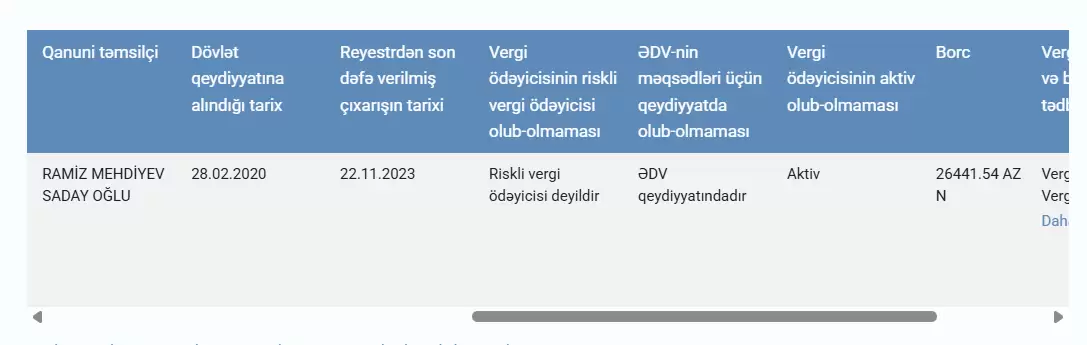 2020-ci ildə yaradılan “Azərmaş Alyans” MMC-nin isə 26 min 441 manat 54 qəpik büdcəyə borcu var. Şirkətin nizamnamə kapitalı 100 manat, qanuni təmsilisi Mehdiyev Ramiz Saday oğludur.