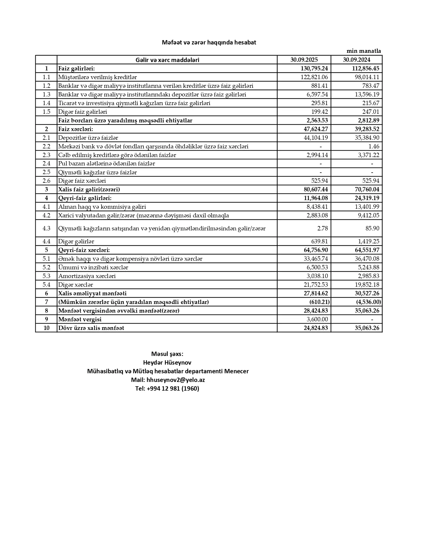 2025-ci ilin iyul-sentyabr aylarında “YeloBank” ASC-nin xalis mənfəəti 24 824,83 manata olub.
