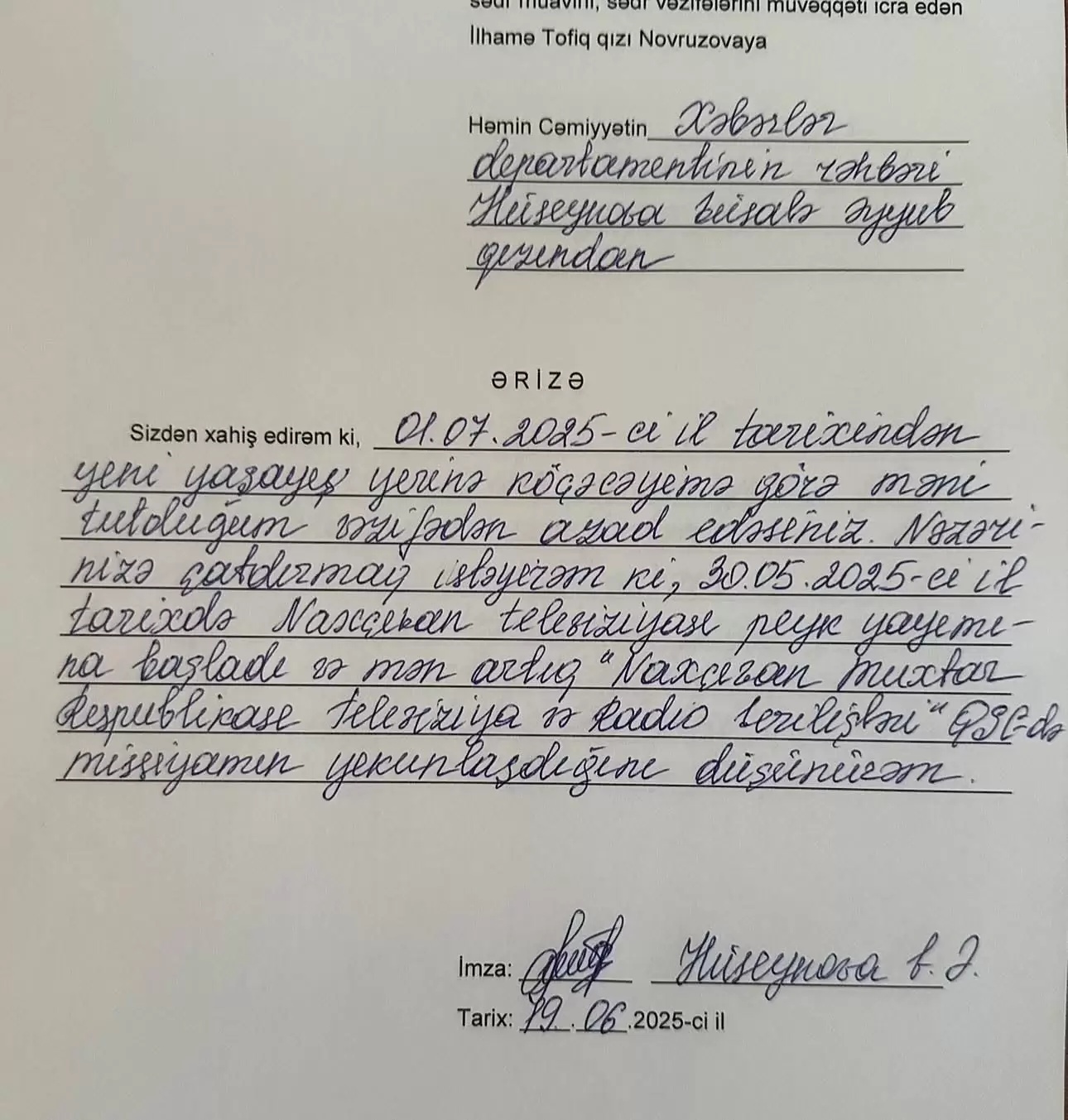 01.07.2025-ci ildə “Naxçıvan Muxtar Respublikası Televiziya və Radio Verilişləri” QSC-dəki missiyam yekunlaşdı (30.05.2025-NTV peyk yayımına başladı) və mən Xəbərlər Departamentinin rəhbəri vəzifəsindən öz istəyimlə ayrıldım.