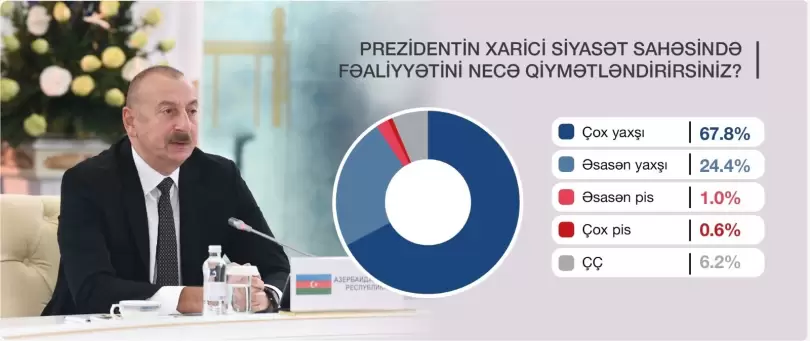 Sorğunun nəticələrinə əsasən, Prezidentin xarici siyasət sahəsində fəaliyyətini respondentlərin 67.8%-i çox yaxşı, 24.4%-i əsasən yaxşı olaraq qiymətləndirib. Sorğu iştirakçılarının 1.0%-i bu sahədə fəaliyyəti əsasən pis, 0.6%-i çox pis kimi dəyərləndirib. Respondentlərin 6.2%-i bu barədə rəy bildirməkdə çətinlik çəkib.