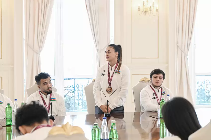 Qadın güləşçi Jalə Əliyeva dedi: Cənab Prezident, bu gün burada çıxış etmək mənim üçün böyük şərəfdir. Mən dörd il bundan qabaq da Sizinlə görüşdə iştirak etmişdim. 23 yaşadək güləşçilər arasında Avropa çempionu olmuşdum. Bu dəfə isə böyüklərdən ibarət yarışda Avropa mükafatçısı oldum. Biz Sizin diqqət və qayğınızı hər zaman hiss edirik. Bizi dəvət etdiyiniz üçün təşəkkür edirəm. Çox sağ olun.