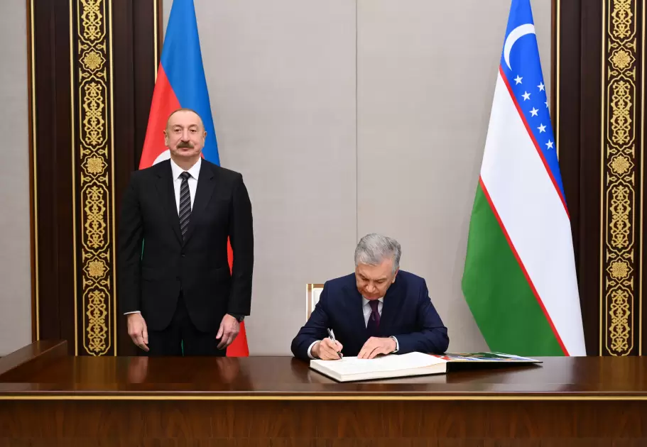 Bina ilə tanışlıqdan sonra Prezidentlər İlham Əliyev və Şavkat Mirziyoyev səfirliyin Fəxri qonaqlar kitabına ürək sözlərini yazdılar.