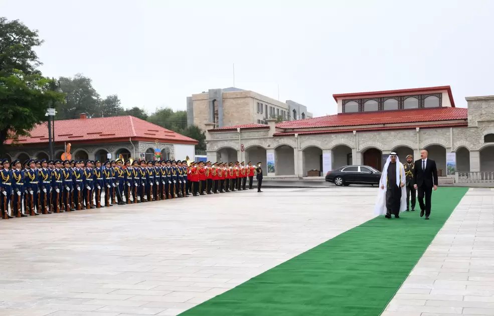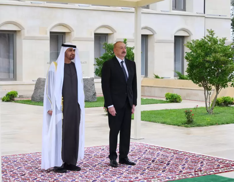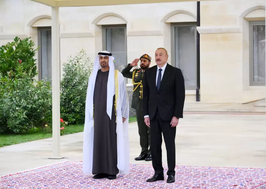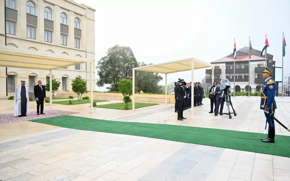 "PostMedia" xəbər verir ki, hər iki ölkənin dövlət bayraqlarının dalğalandığı meydanda Birləşmiş Ərəb Əmirliklərinin Prezidentinin şərəfinə fəxri qarovul dəstəsi düzülmüşdü.