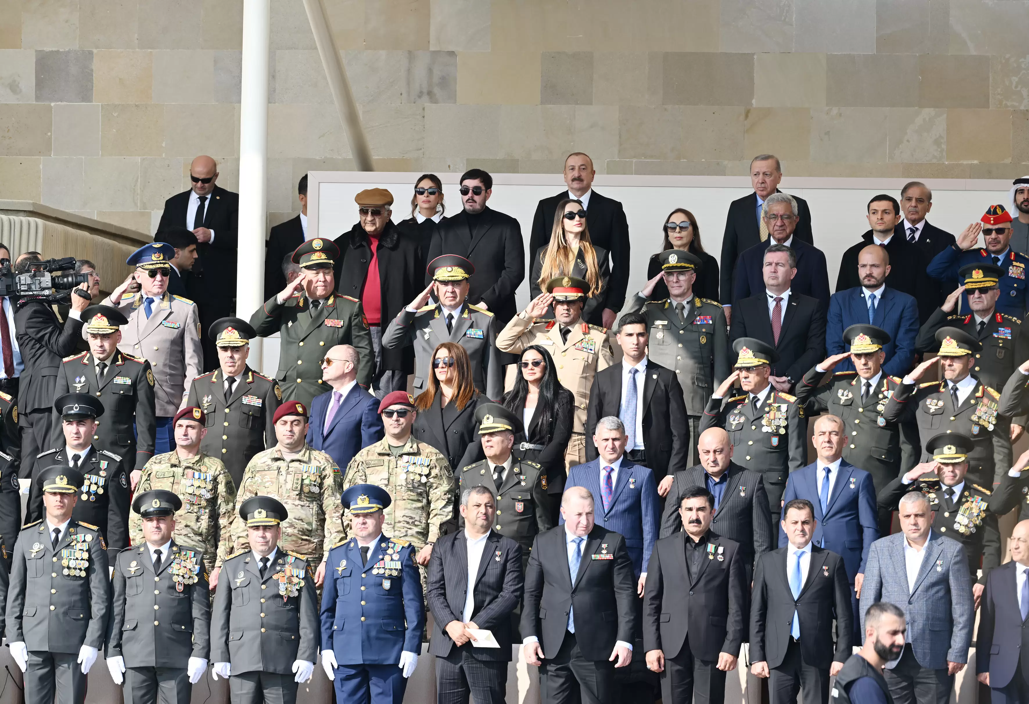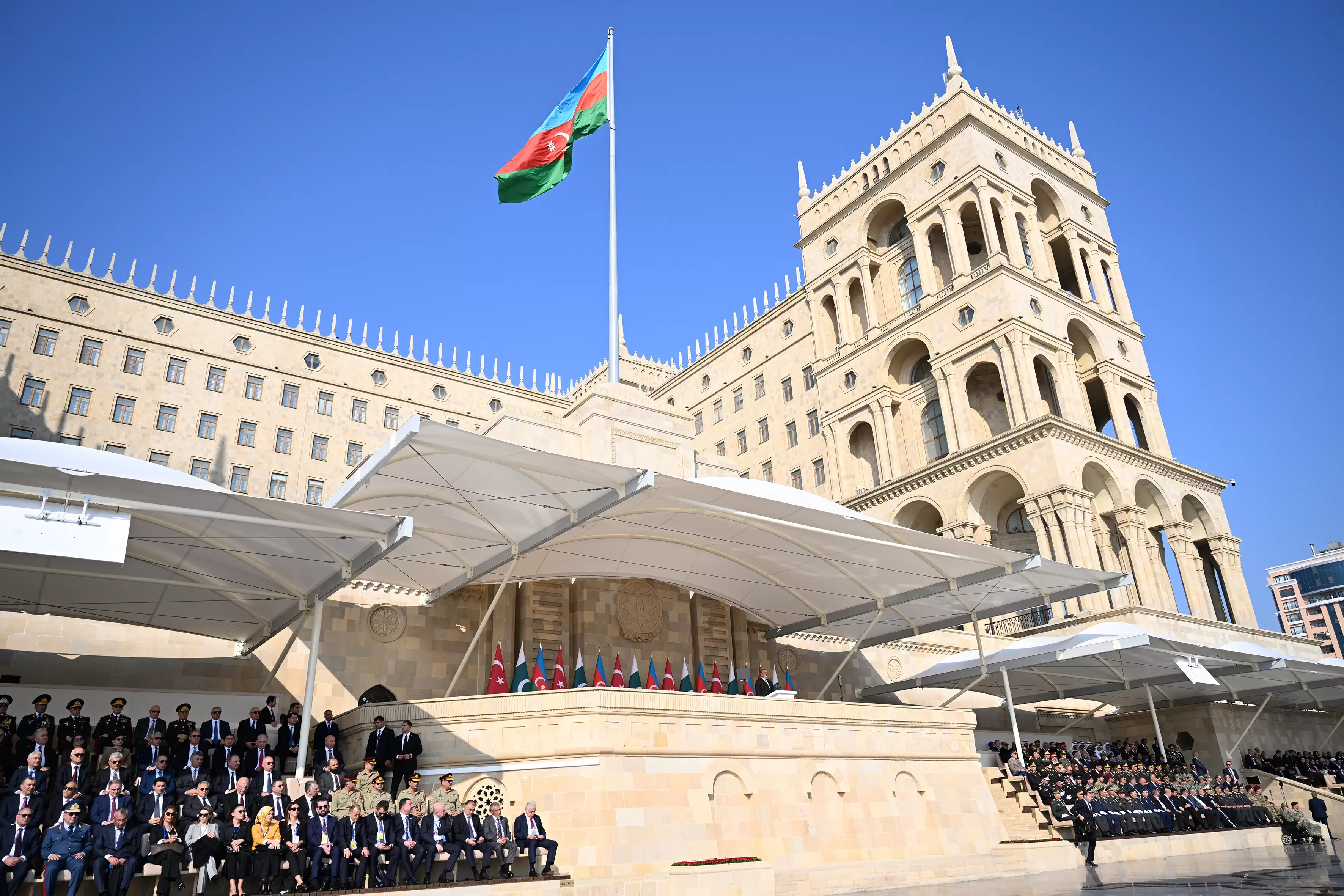 "PostMedia" xəbər verir ki, Azərbaycan Respublikasının Prezidenti İlham Əliyev, birinci xanım Mehriban Əliyeva, Türkiyə Respublikasının Prezidenti Rəcəb Tayyib Ərdoğan, Pakistan İslam Respublikasının Baş naziri Məhəmməd Şahbaz Şərif paradda iştirak ediblər.