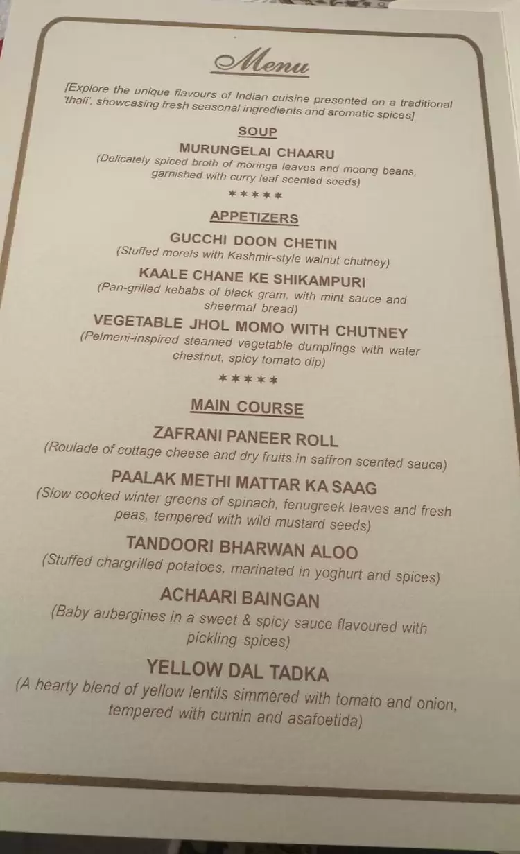 İlk yemək "moringa" yarpaqları və "mung" lobyası ilə hazırlanan yüngül şorba olub, ədviyyatlar və korek ilə zənginləşdirilmişdir. Aperitiflər arasında qoz ləpəsi ilə doldurulmuş göbələk, nanə souslu qara noxud kabablar və momo üslubunda buxarda bişmiş tərəvəzli pelmenlər təqdim olunub.